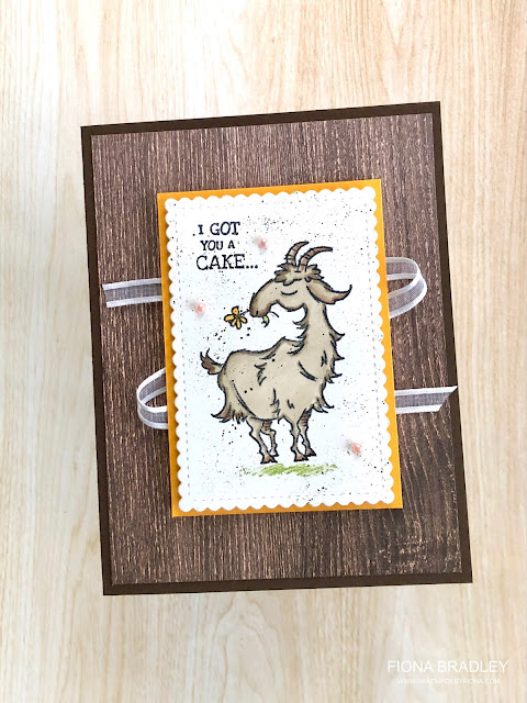I used my Crumb Cake Stampin' Blends (and a touch of Daffodil Delight and Granny Apple Green) before masking off the goat to flick my Basic Black marker pen over the background.